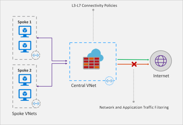 • Centrally create, enforce, and log application and network connectivity policies across Azure subscriptions and VNETs