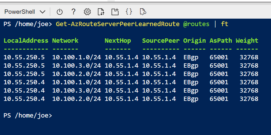 So to help, as promised, here is a repo that will build a test footprint for you. I’ve taken the Route Server tutorial using Quagga and integrated it with theother services from this article. You can follow the steps to complete the configuration and confirm you have a functioning peer. You should see output similar to the below from Cloud Shell: