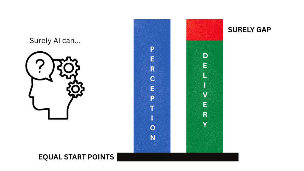 When C-level look for AI adoption, they think of productivity return-on-investment, people management, time to market, and competition. This is no different than any other type of adoption, but I think AI carries a much tougher perception problem. In a presentation back in the Summer, and in every AI discussion since, I have discussed and named this as the ‘surely gap’.