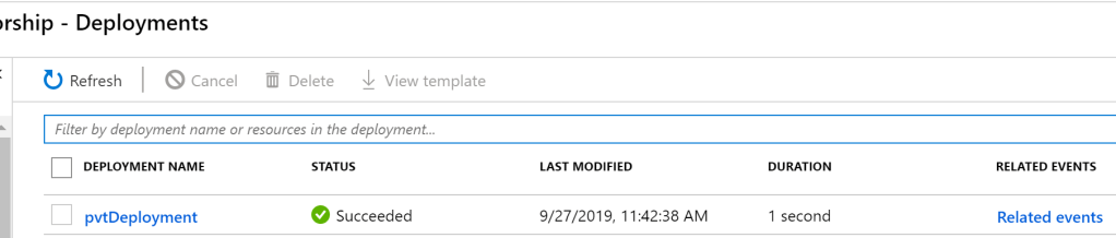 You should receive a succeeded message within your shell and you can verify via the Portal. As it was a subscription level deployment, head to your Subscription blade and check the Deployments tab. You should see the Template listed as the same name as you ran for the deployment.